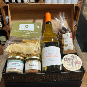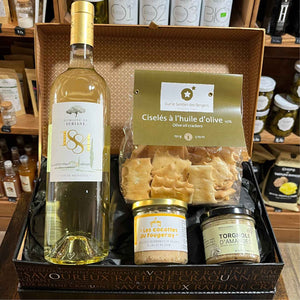 Unsere Gourmet-Geschenkboxen enthalten sorgfältig ausgewählte handwerkliche Produkte: Terrinen, Kekse, Schokolade, Marmeladen, Honig, Weine, Aperitifs und viele weitere Schätze aus dem französischen Terroir. Jede Komposition ist darauf ausgelegt, die Geschmacksknospen von Feinschmeckern zu erfreuen!