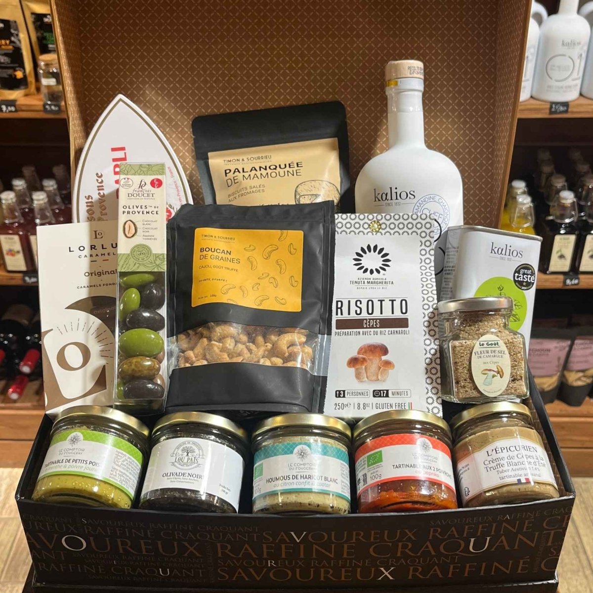 Unsere Gourmet-Geschenkboxen enthalten sorgfältig ausgewählte handwerkliche Produkte: Terrinen, Kekse, Schokolade, Marmeladen, Honig, Weine, Aperitifs und viele weitere Schätze aus dem französischen Terroir. Jede Komposition ist darauf ausgelegt, die Geschmacksknospen von Feinschmeckern zu erfreuen!