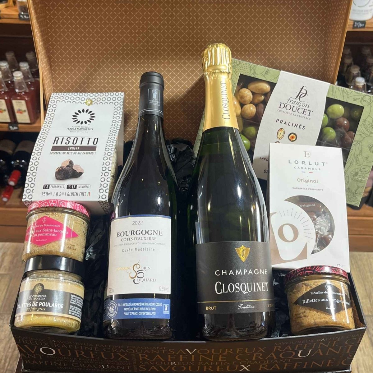 Unsere Gourmet-Geschenkboxen enthalten sorgfältig ausgewählte handwerkliche Produkte: Terrinen, Kekse, Schokolade, Marmeladen, Honig, Weine, Aperitifs und viele weitere Schätze aus dem französischen Terroir. Jede Komposition ist darauf ausgelegt, die Geschmacksknospen von Feinschmeckern zu erfreuen!