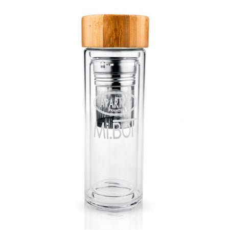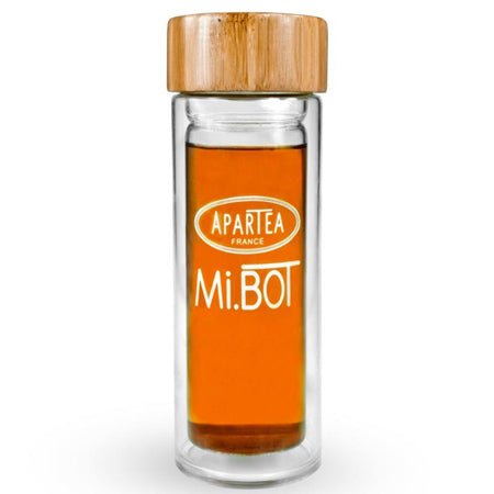Perfect for taking anywhere with you, discover our Mi.BoT Tea Infuser. This 380ml glass bottle has a double wall to prevent the risk of burns. Thanks to its very thin infuser basket, it doesn't let any pieces of leaf through. Its bamboo cap gives it a very trendy look. You can drink your tea all day long.