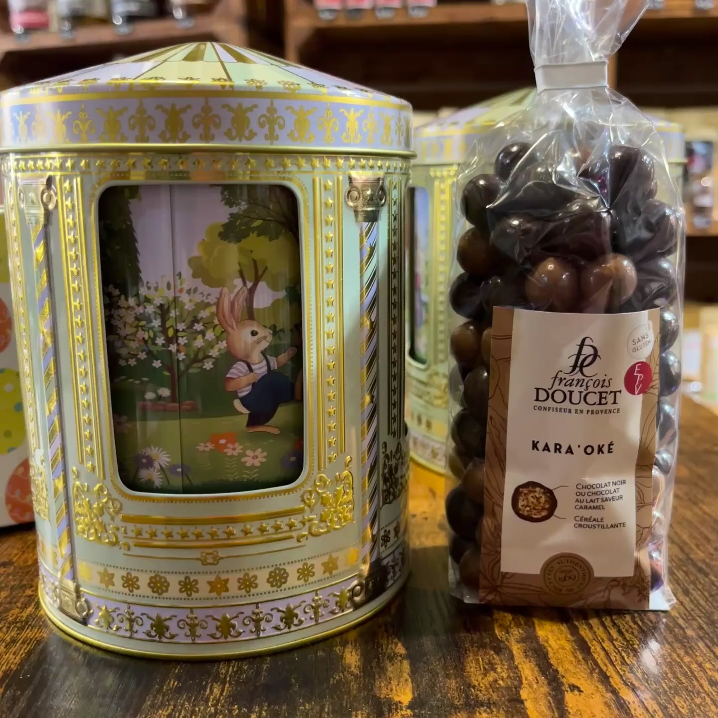 This magnificent Rabbit Carousel Metal Box is filled with 200g of François Doucet Karaoke Chocolates . This elegant and highly original musical carousel will delight young and old alike this Easter. Guaranteed to be a hit!