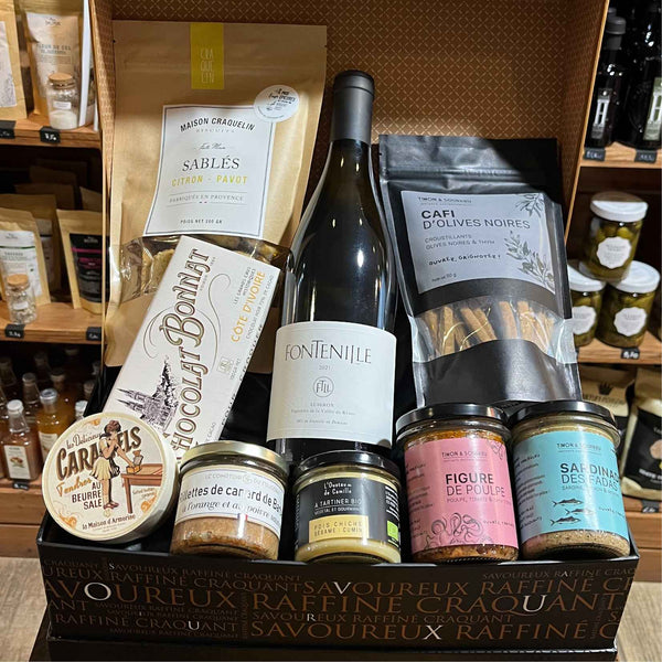 Our gourmet gift boxes feature carefully selected artisanal products: terrines, biscuits, chocolates, jams, honey, wines, aperitifs, and many other treasures from the French terroir. Each composition is designed to delight the taste buds of epicureans!