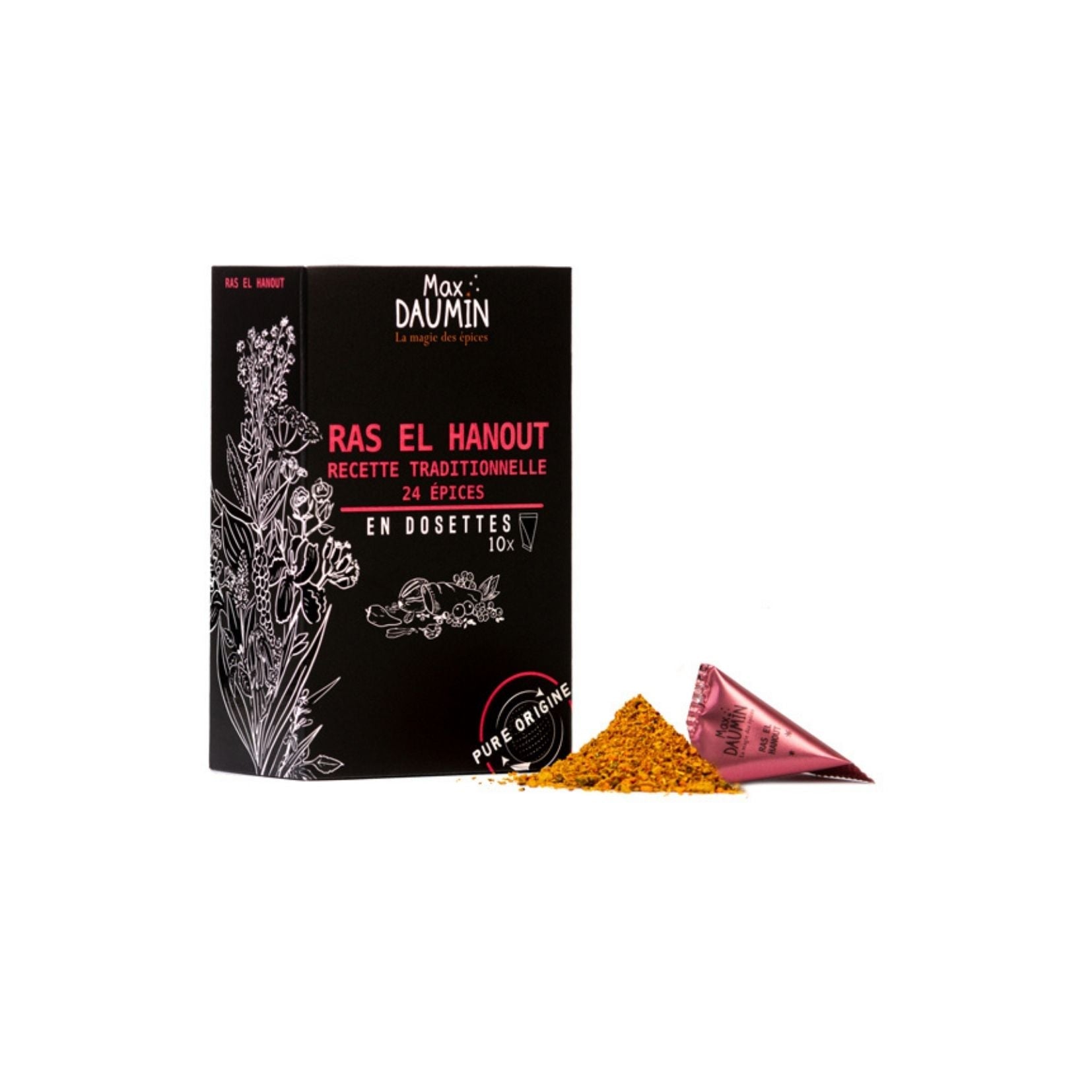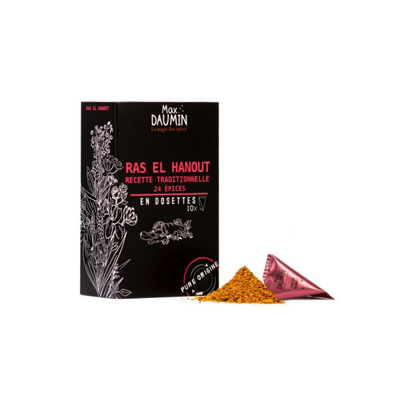 This Ras El Hanout Traditional Recipe from Max Daumin is a journey in itself. At first bite: its flavor opens towards an enchanting Orient, dreamy, soft and sweetened by Ceylon cinnamon; slightly enhanced by its five peppers, the warm fragrances of an ancestral combination Turmeric, Ginger, Cumin, Nutmeg, Coriander. In the end, a floral complexity comes to the smell and taste: it is the addition of cardamom, Centifolia Rose, Galangal and Iris root with violet scents. Ras el Hanout reconnects with traditional recipes, 24 spices compose it. Ras el Hanout is one of the most complex spice blends that can be found. Traditional recipes for Ras el Hanout vary between 24 and 27 spices, you can find some that contain 40! Ras el Hanout literally means "Head of the grocery store", the best in the store. A few words about the choice of packaging: The berlingot is made and printed in Isère. This over-packaging, i.e. the 10 berlingots in a box, represents 2/3 of an 80g A4 sheet. This allows you to preserve your spices completely without them deteriorating.