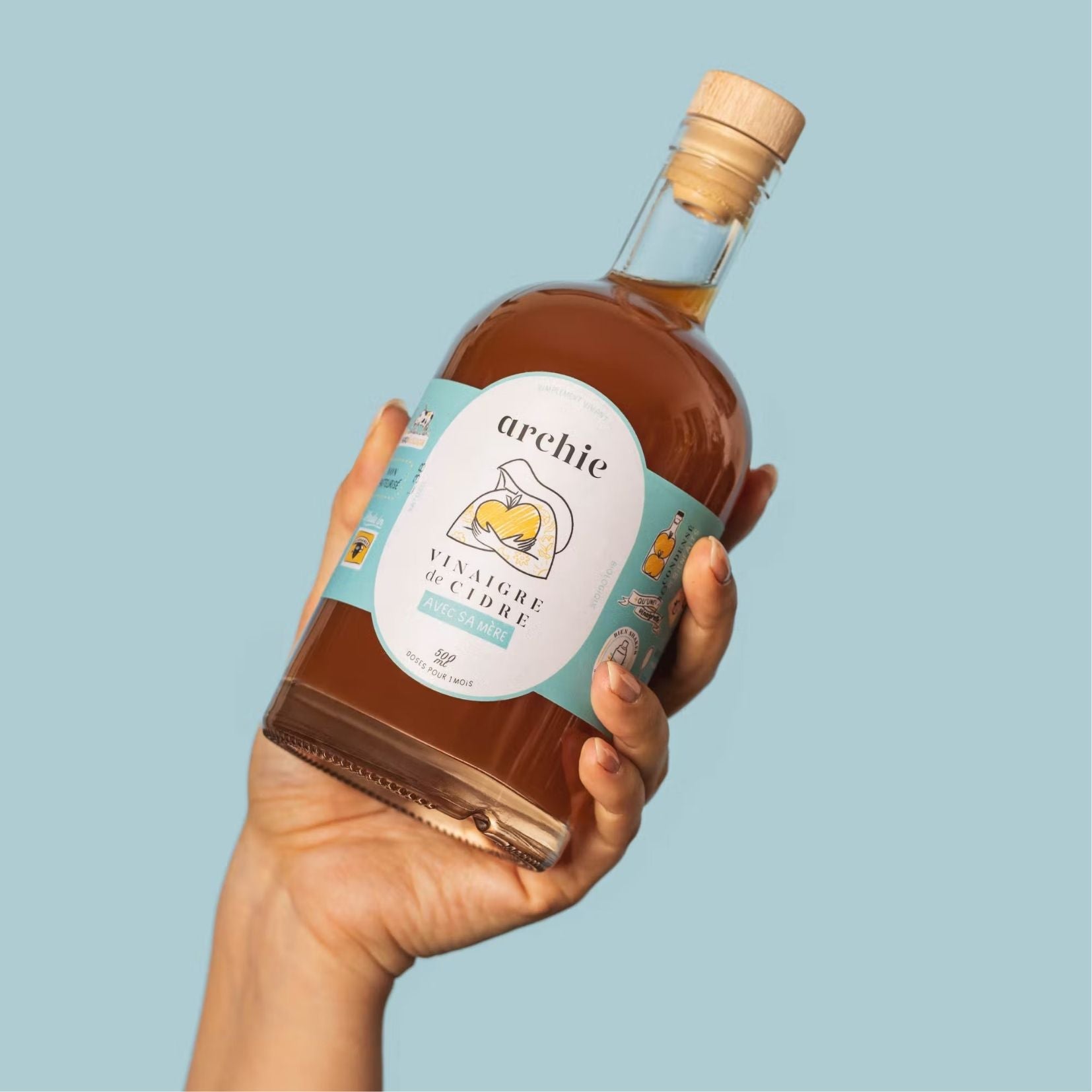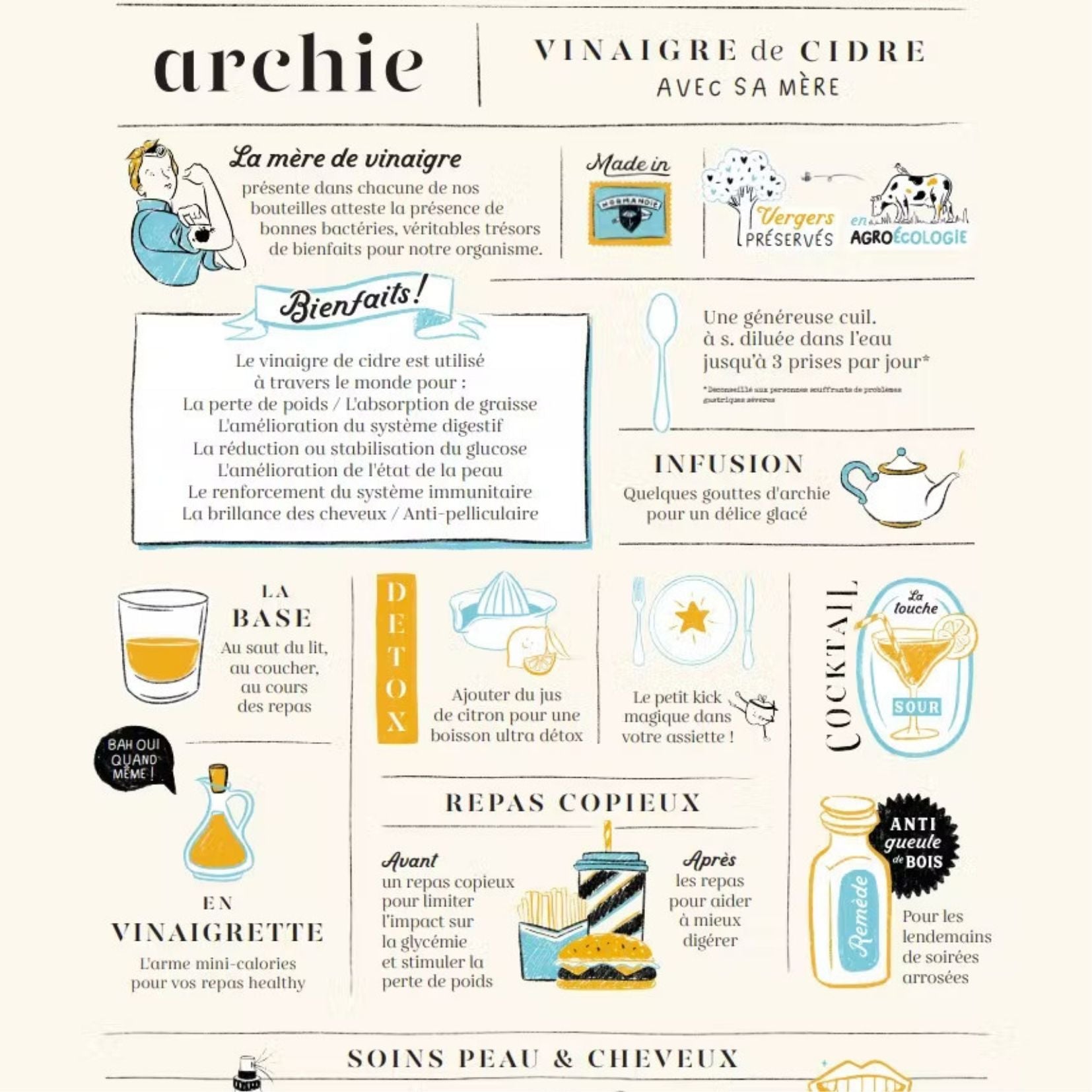 Discover Archie cider vinegar, which has been revolutionizing the world of this condiment for the past year. In the routine of over 20,000 customers, it changes their daily lives thanks to its remarkable benefits on our bodies ( digestion, weight loss , etc.). And its unique taste also allows it to be used by the greatest starred chefs in the world and to be multi-awarded. An exceptional organic cider vinegar . Made in a three-hundred-year-old orchard, according to an ancestral method, aged in barrels, from 15 varieties carefully selected for a unique taste. The mother of vinegar present in each of our bottles is naturally formed during the fermentation process. It is a concentrate of proteins and good bacteria. A French glass bottle is accompanied by a pouring cap made of unvarnished natural wood. The silica label and vegetable ink used make it 100% recyclable or reusable as desired. Taking a daily dose of Archie contributes to maintaining a healthy lifestyle as part of a balanced diet.