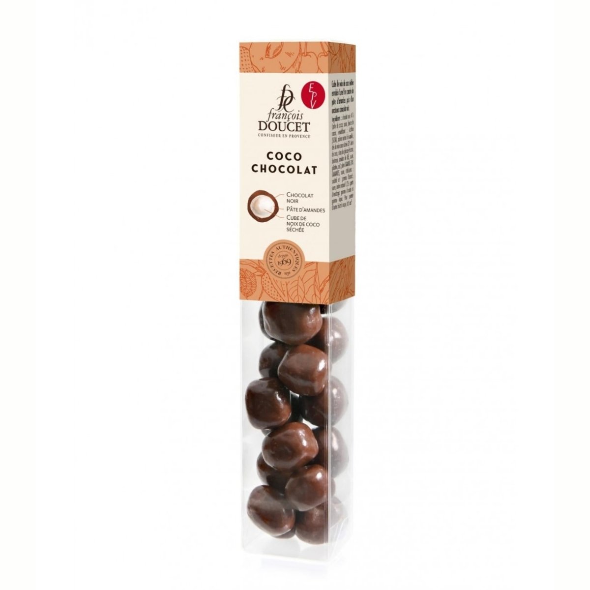 Let yourself be seduced by the artisanal Coco Chocolat : a melting heart of dried coconut coated in almond paste and a thin layer of intense dark chocolate . Carefully made according to Provençal know-how, this delight combines textures and aromas: the exquisite sweetness of coconut, the roundness of almond, and the measured power of cocoa.