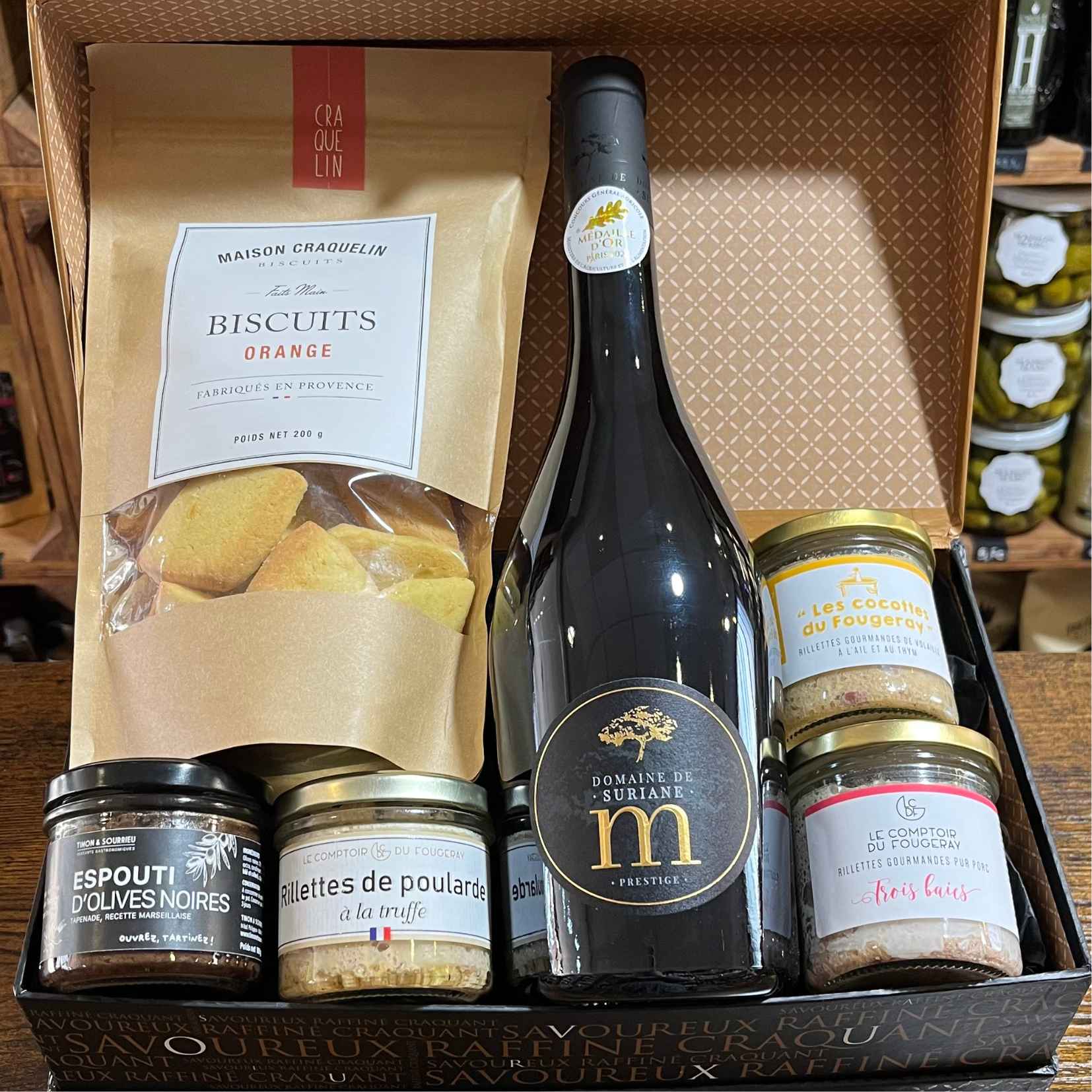 A gift box filled with 6 artisanal specialties: savory spreads, sweet biscuits and a bottle of Provence wine.