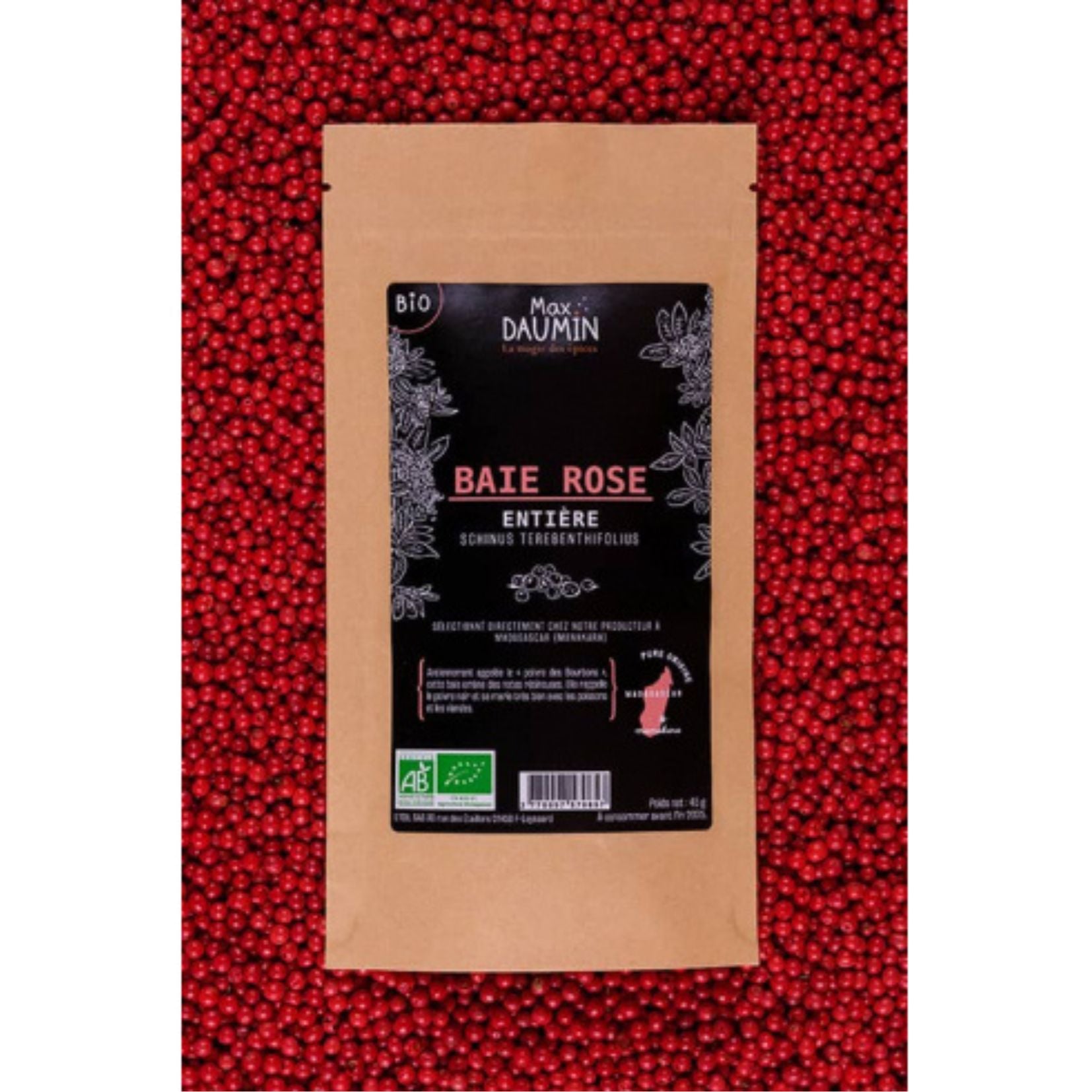 La baie rose est un faux-poivre appelé parfois poivre des Bourbons, poivre de la réunion, poivre du Chili, poivre Brésilien, poivre rose. Son goût rappelle le poivre mais sans piquant, avec des notes fruitées et de coriandre, sur un fond résineux. Elle est légèrement sucrée. Elle s’accorde pleinement avec les viandes rouges, volailles, salades, soupes et poissons. C’est une épice à la fois décorative mais extrêmement subtile et délicate. A découvrir. Cette baie rose est issue de l'agriculture biologique.
