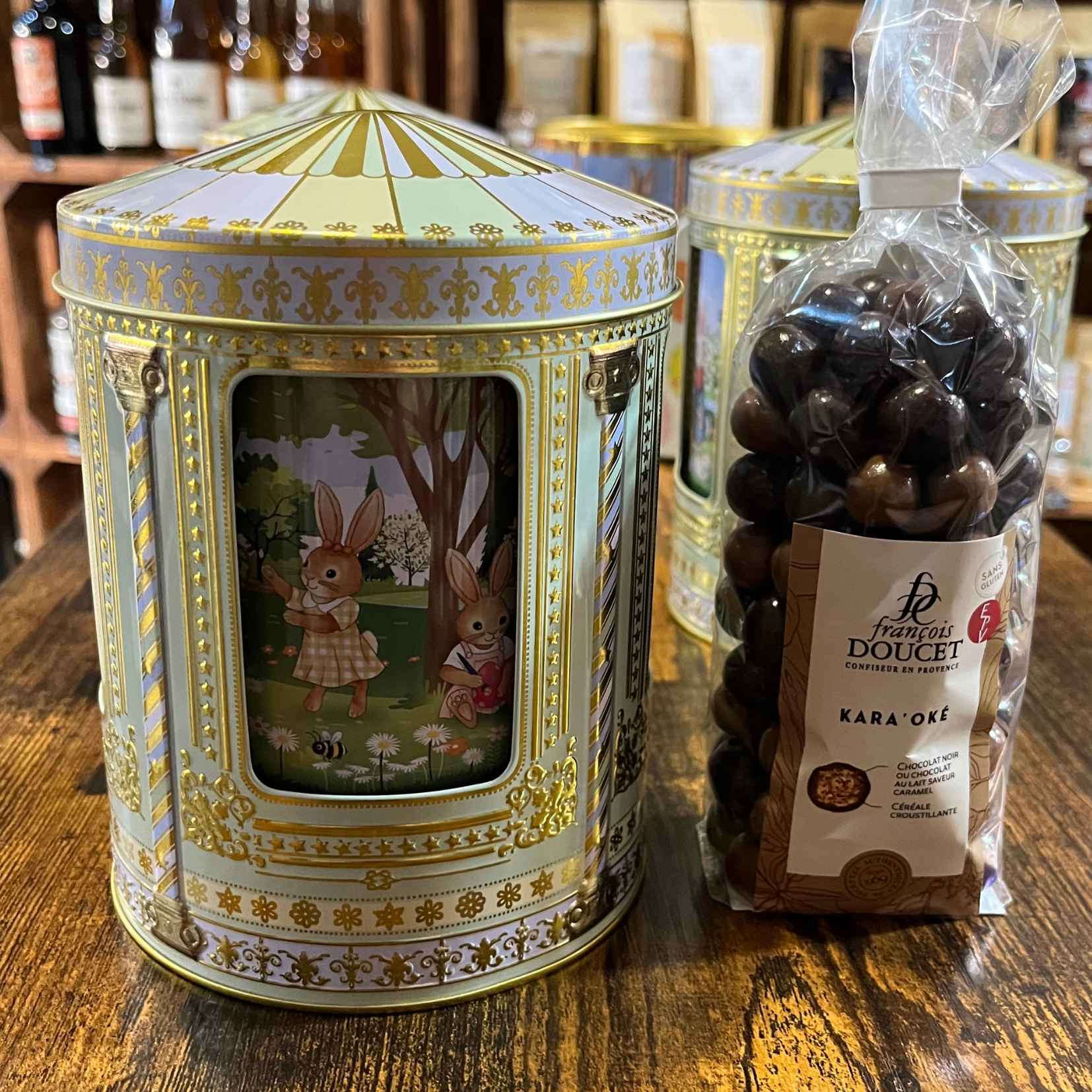 Cette magnifique Boîte Métallique Carrousel Lapin est garnie de 200g de chocolats Karaoké François Doucet. Ce carrousel musical d'une grande élégance et très original ravira les petits comme les grands pour Pâques. Effet garanti !