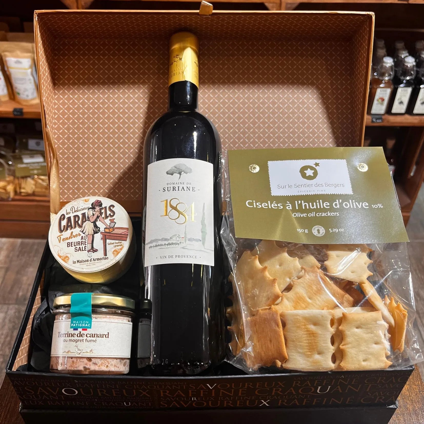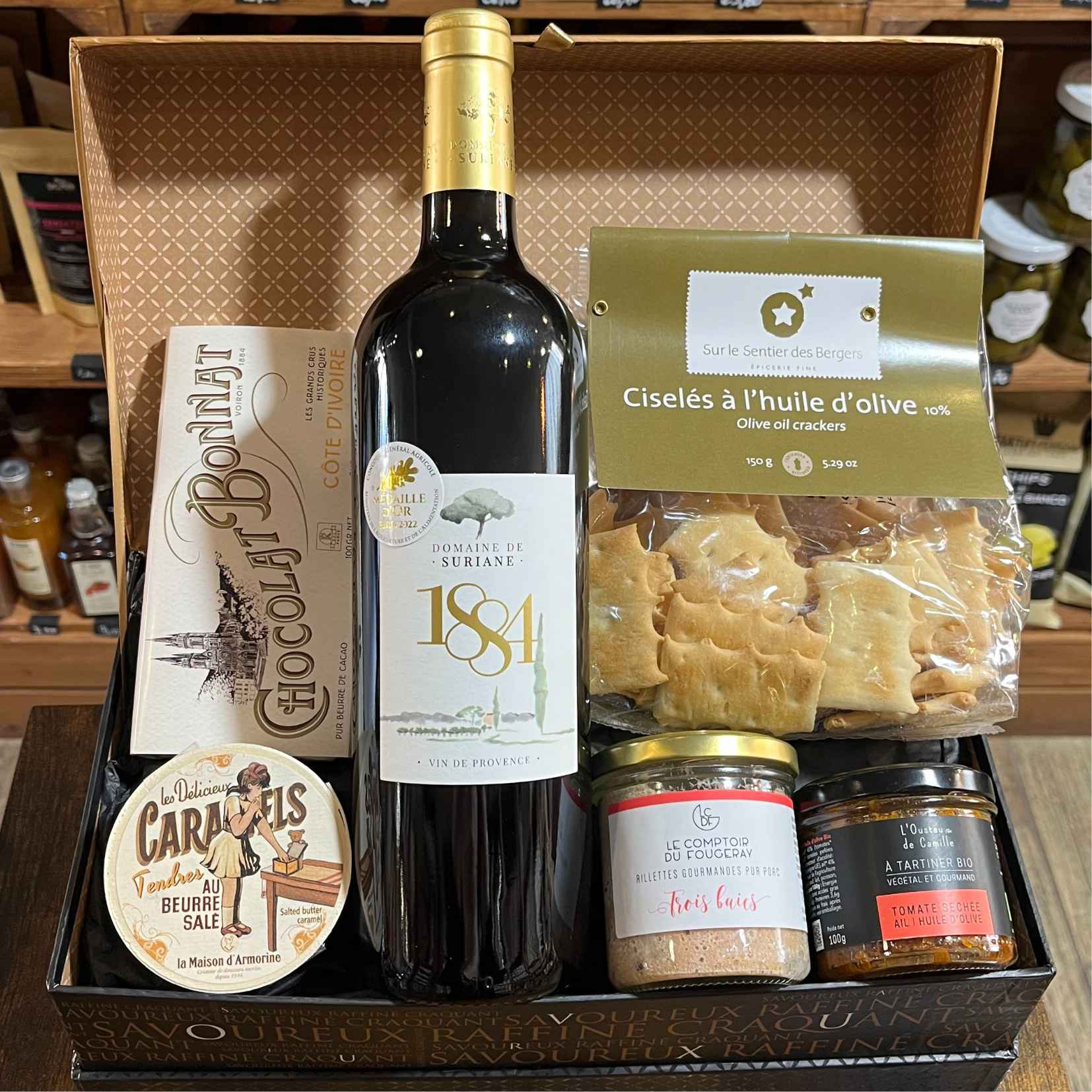 Un coffret apéro de 4 spécialités artisanales : tartinables salés, biscuits salés, sucreries et vin rouge de Provence.