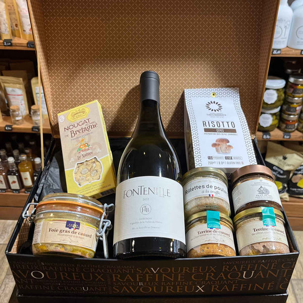 Nos coffrets gourmands sont composés de produits artisanaux soigneusement sélectionnés : terrines, biscuits, chocolats, confitures, miels, vins, apéritifs, et bien d’autres trésors du terroir français. Chaque composition est pensée pour ravir les papilles des épicuriens !