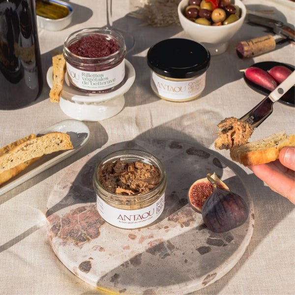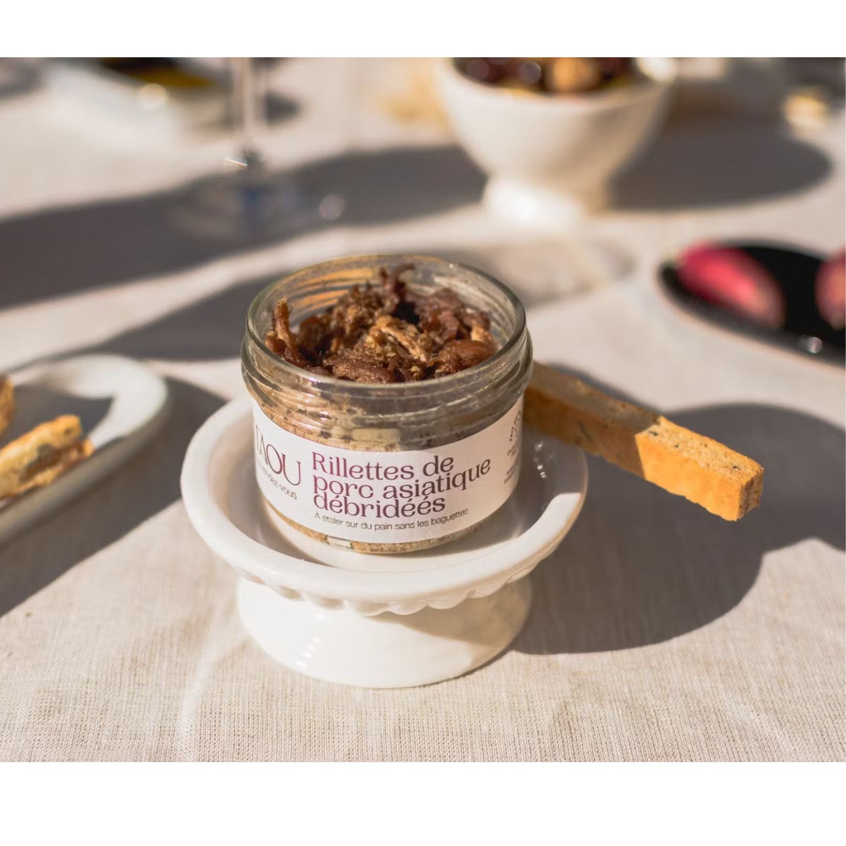 Ces Rillettes de Porc d'Antaou s’inspirent du Adobo philippin, une recette ancestrale qui signifie marinade. Dès les premières bouchées vous serez séduits par la caramélisation de la viande qui préserve un cœur fondant. Ca va faire Umami dans votre bouche : l’acidité contrebalance avec le gras pour vous laisser un goût d’y revenez-y. Pour un apéritif ensoleillé utilisez les Biscottines Antaou pour accompagner vos rillettes.