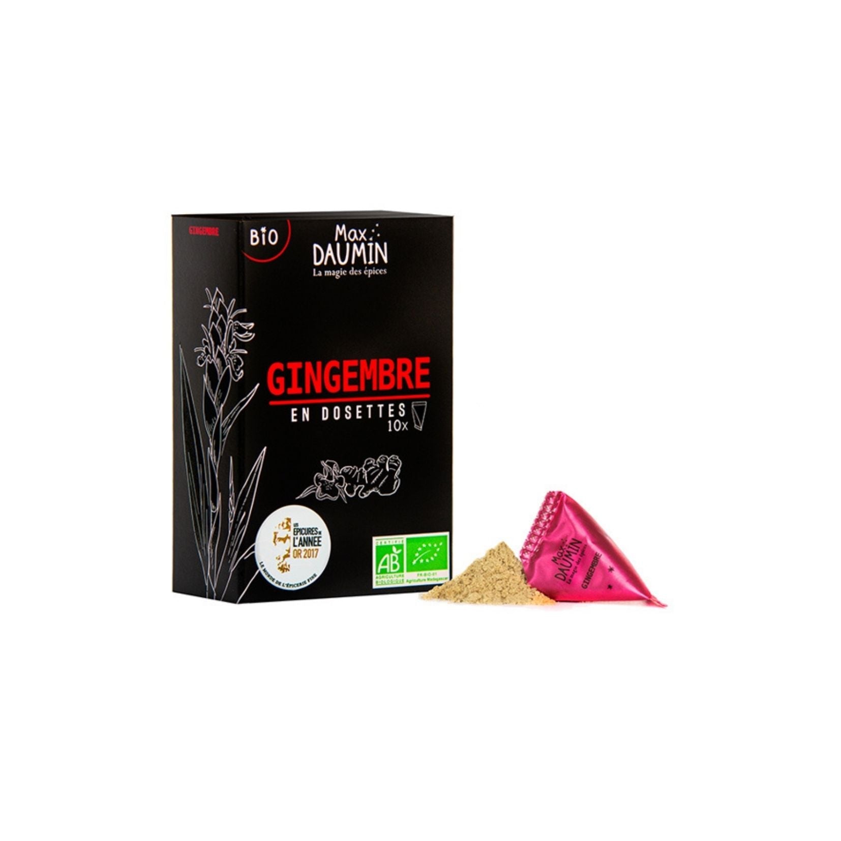 Ce Gingembre Bio de Madagascar de la maison Max Daumin est très parfumé, il a un joli contraste de fraicheur et de chaleur. Tous ses parfums originels se retrouvent intacts dans le berlingot, comme si vous veniez de la râper. De la même famille que le curcuma, le gingembre (Zingiber officinalis) est une plante formée d’une grande tige d‘un mètre de hauteur supportant de longues feuilles odorantes. Le rhizome (racine) renfermant une pulpe jaune est l’épice utilisée. Le rhizome est utilisé sous différentes formes : condiments, confit, en poudre, frais et râpé. Le gingembre s’associe volontiers avec le curcuma, la vanille, le poivre. Quelques mots sur le choix du packaging : Le berlingot est réalisé et imprimé dans l’Isère. Ce surpackaging, soit les 10 berlingots d’une boite, représentent 2/3 d’une feuille A4 80g. Il permet ainsi de conserver intégralement vos épices sans qu’elles ne se dégradent.