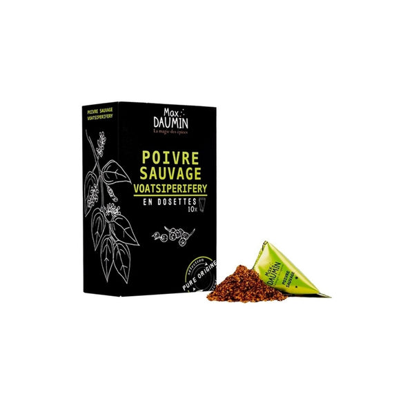 Ce Poivre Sauvage Voatsiperifery de la maison Max Daumin est cueilli sur lianes dans la forêt de Ranomafana, le poivre sauvage Voatsiperifery est un poivre remarquable et unique. Max Daumin propose ce poivre « pur ». Après la récolte il dispose d’une petite queue, celle-ci est enlevée par leurs soins et le berlingot ne contient uniquement que toute la pure quintessence de ce poivre. Le berlingot vous apportera toute la magie de ce poivre et restituera sa couleur ocre si caractéristique. Le poivre sauvage de Madagascar est un poivre sauvage que l’on récolte en forêt sur des lianes. Appartenant à la famille des poivres, Il s’agit du Piper borbonense (Miq.) C. DC., 1869 autrement dit le poivrier des Bourbons. La cueillette s’effectue sur ses lianes. Celle-ci reste acrobatique et périlleuse. A l’instar du poivre, il présente des grappes de grains de poivres cueilli à maturité quand les fruits deviennent rouge orangés en fin d’année. Quelques mots sur le choix du packaging : Le berlingot est réalisé et imprimé dans l’Isère. Ce surpackaging, soit les 10 berlingots d’une boite, représentent 2/3 d’une feuille A4 80g. Il permet ainsi de conserver intégralement vos épices sans qu’elles ne se dégradent.