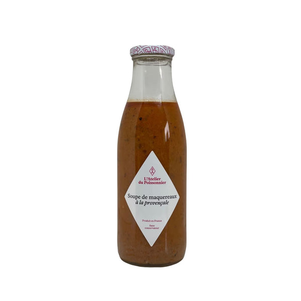 Cette soupe de Maquereaux à la Provençale est signée l'Atelier du Poissonnier. Un subtil mélange de légumes provençales utilisés pour la ratatouille et du maquereau. A déguster nature ou accompagnée de rouille, croutons et de fromage râpé.